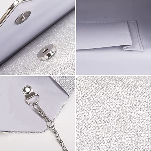 [Classic Envelope Clutch]: This clutch is a classic envelope design with glitter and a metal V-cross trim with a magnetic snap flap for a very stylish outfit that will get you noticed at parties.